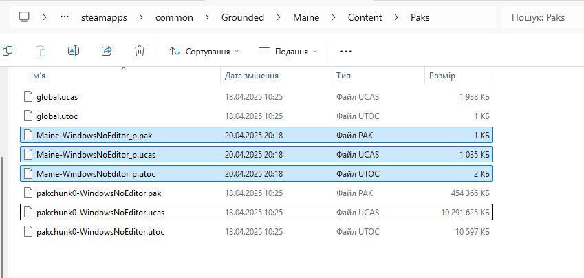 Інструкція: 1. Розпакувати завантажене у папку (чи де там у вас Стім) C:\Program Files (x86)\Steam\steamapps\common\Grounded\Maine\Content\Paks\ поруч з іншими файлами pakchunk0-WindowsNoEditor.* 2. Насолоджуватися перекладом.