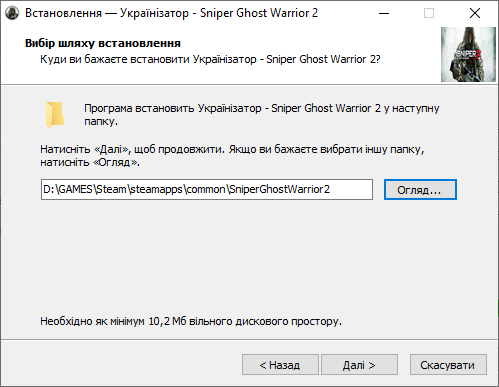 Запустити українізатор Sniper Ghost Warrior 2 - Ukrainian.exe обрати шлях встановлення гри та встановити українізатор. УКРАЇНІЗАТОР ВСТАНОВЛЮЄТЬСЯ ЛИШЕ НА АНГЛІЙСЬКУ ВЕРСІЮ ЗРАЗОК: