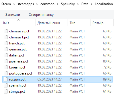 Відкриваємо папку, де знаходяться файли локалізації. Знайти її можна тут: Steam -> steamapps -> common -> Spelunky -> Data -> Localization